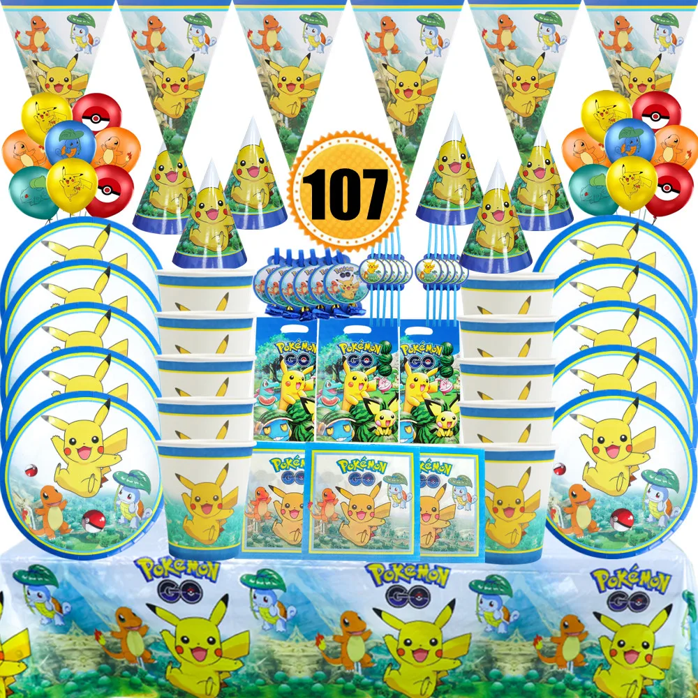 - Decoraciones de fiesta de cumpleaños con temática de dibujos animados para niños, juego de globos de Pikachu, vajilla desechable, suministros de decoración para Baby Shower