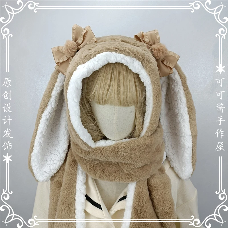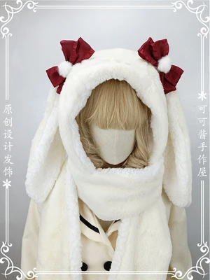 - Lolita-gorro de felpa con Orejas de conejo para estudiantes, gorro japonés kawaii, bufanda, guantes, tríada, gorro de ciclismo, gorros de invierno