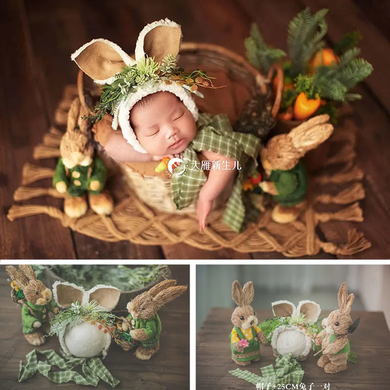- Accesorios de fotografía para recién nacido, estilo campestre, Navidad, Año Nuevo, conjunto de sombrero de conejo de paja, accesorios de fotografía para bebé, niña y niño