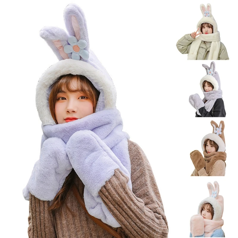 - Gorro con orejas de conejo para mujer, bufanda bonita de dibujos animados, suave y cálida con capucha, 3 piezas, Invierno