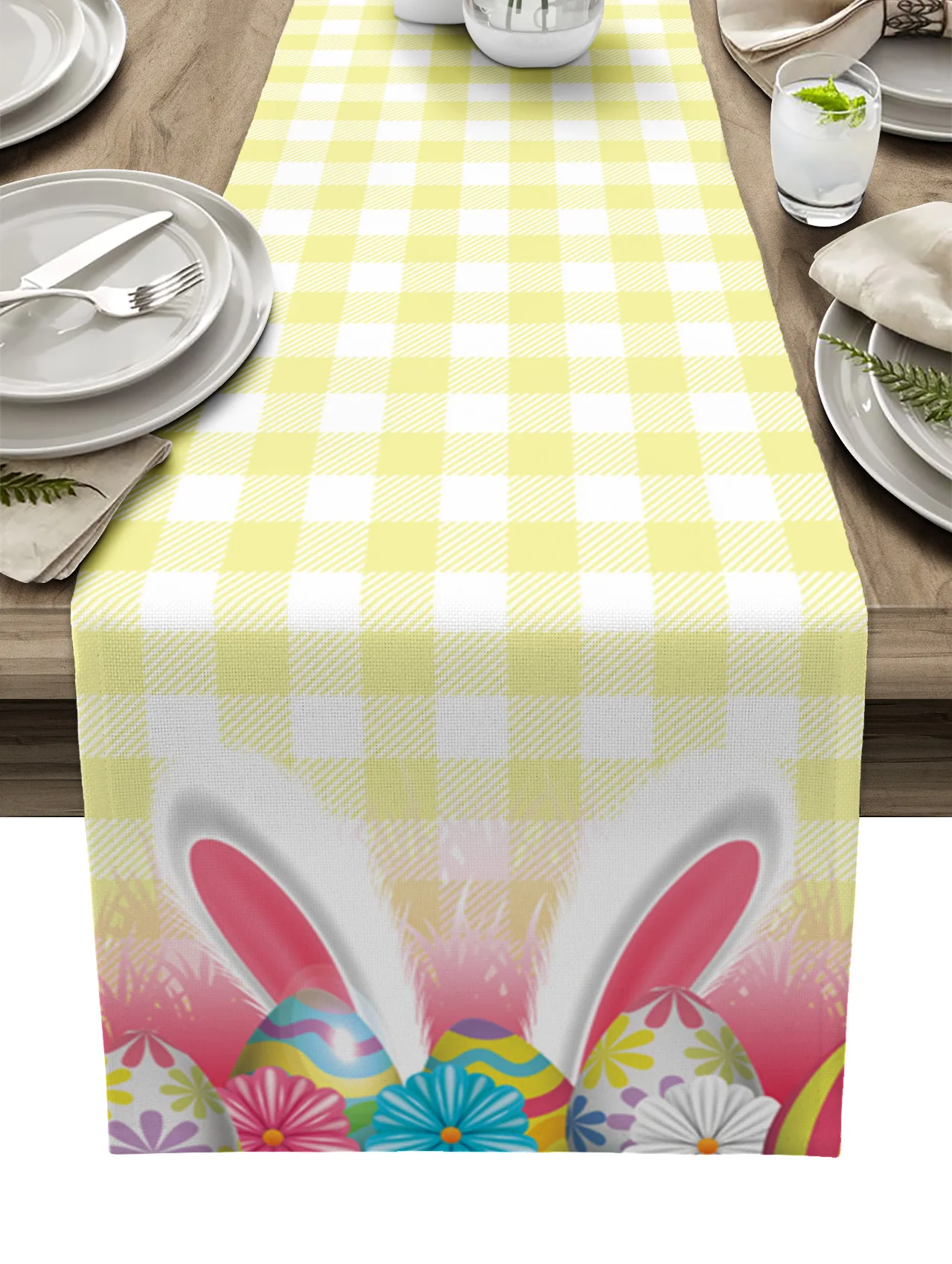 - Camino de mesa a cuadros con Orejas de conejo y huevos de Pascua, decoración de boda, cubierta de mesa moderna, mantel de decoración para mesa de comedor y fiesta